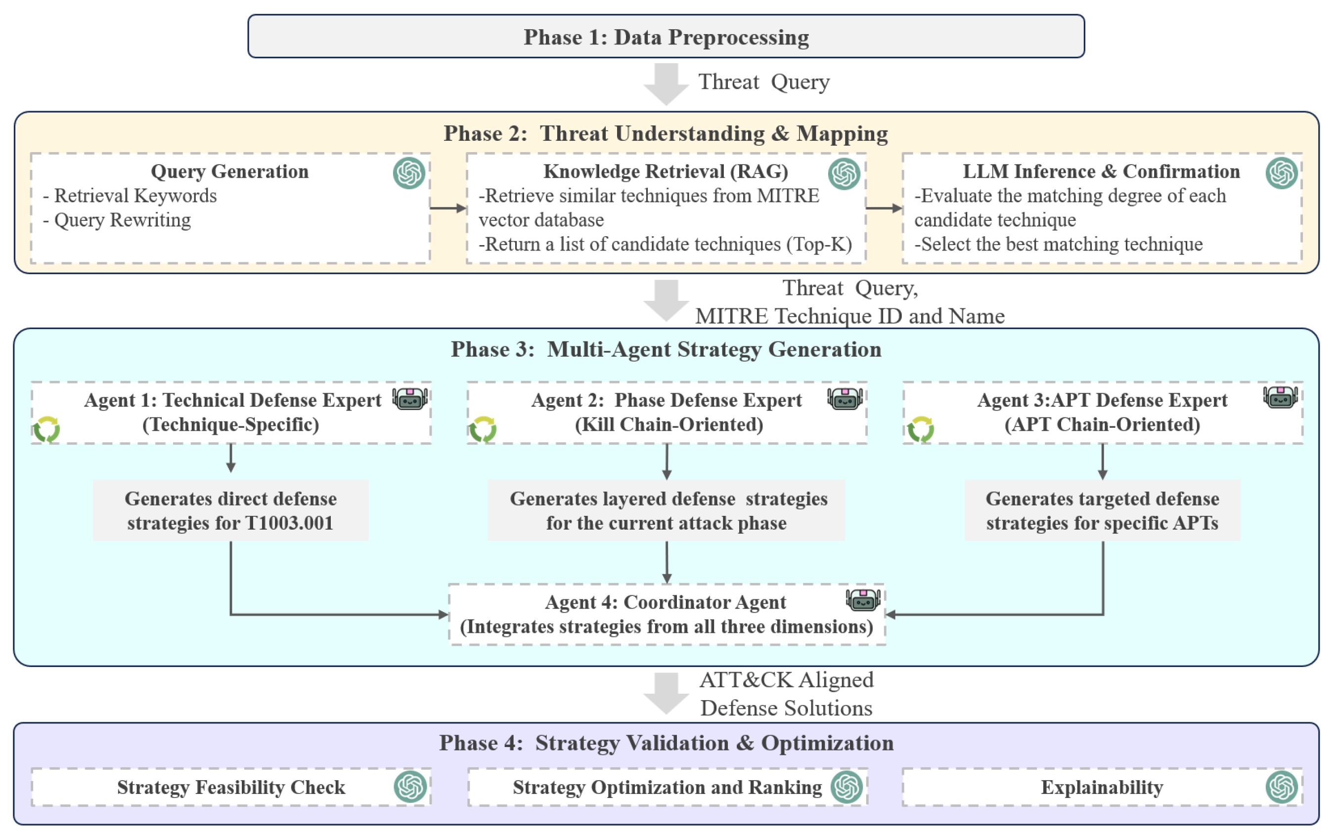 Agent 4 serves as an intelligent integrator that synthesizes the outputs from the three expert agents into a unified, coherent defense plan . The coordinator performs four critical functions: (1) deduplication and conflict resolution, identifying redundant recommendations across agents and resolving logical inconsistencies; (2) prioritization, ranking strategies by effectiveness for the specific threat scenario using criteria such as immediacy of impact, implementation complexity, and expected risk reduction; (3) contextualization verification, ensuring all recommended strategies remain relevant to the original threat query q and are not generic ATT&CK guidance disconnected from the scenario; and (4) gap analysis and enhancement, identifying missing defensive controls not covered by the expert agents and augmenting the strategy accordingly. The coordinator is prompted with all three expert outputs and the original threat context, generating a structured defense plan organized into categories (immediate actions, detection strategies, prevention controls, monitoring and alerting, threat hunting, response and recovery) with explicit priority levels and source attributions. This integration step transforms independently generated defensive perspectives into a comprehensive, operationalized defense strategy that security teams can directly implement.