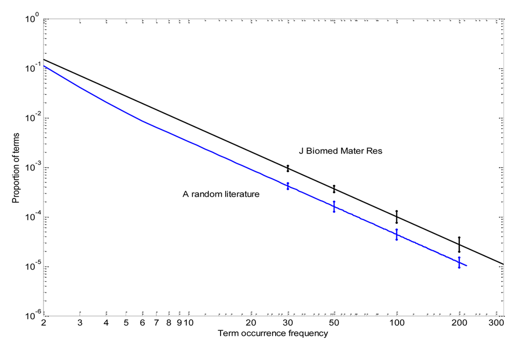 Figure 1 shows the raw distribution of term occurrence frequencies in the text fields (i.e., title or abstract) for Journal of Biomedical Materials Research compared to a random literature of similar size. Term occurrence frequency was almost exactly linear for the journal when plotted on a log-log scale, indicating that frequencies followed a regular Zipf distribution. The frequencies for the random set followed a parallel curve and were significantly different from that of the journal.