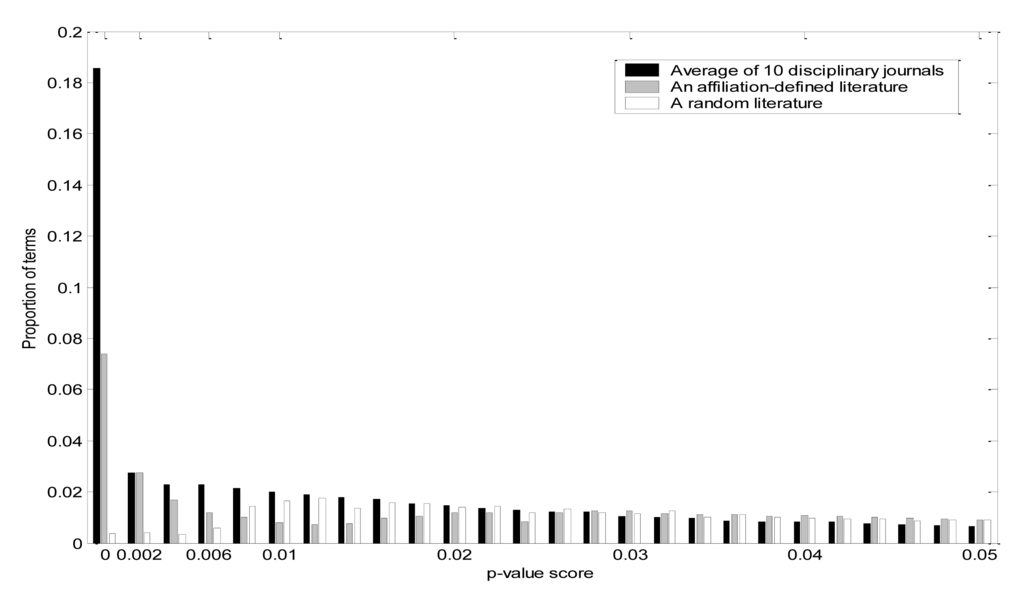 To identify individual terms that were significantly more frequent than expected by chance, we computed p-value scores for each term across 10 disciplinary journals and plotted the average p-value scores in comparison to the California set and to a random set of 5,000 articles (Figure 2). Although terms associated with p-values < 0.05 are nominally significant, that does not take into account the fact that multiple tests are carried out. Figure 2 emphasizes that the difference between journal-defined sets and random sets is most striking at p-values below 0.001. Thus, we have chosen p < 0.001 as our preferred cut-off value, and the set of terms in a literature with p-values below 0.001 will be called the characteristic terms of that literature.