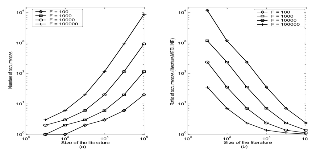 For the set of 10 disciplinary journals, the set of characteristic terms comprise, on average, 18% of the total terms in that literature. The cut-off criteria for deeming a term as “characteristic” vary systematically as functions both of literature size and term frequency within MEDLINE (Figure 3). Among the entire set of characteristic terms for the 10 disciplinary journals, average term occurrence is 23 times within the set of journal articles, which is 88 times more frequent in that literature than in MEDLINE.