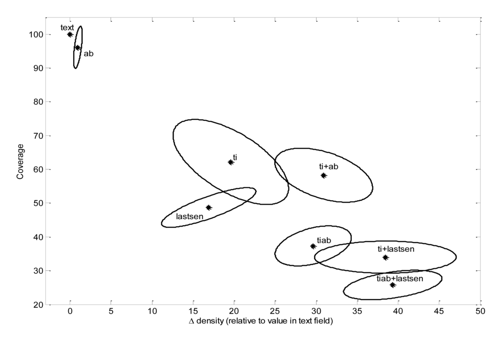 One basic measure is the “density”—this is the percentage of all terms in each section that are comprised of characteristic terms. Those sections that are high in density are relatively rich in characteristic terms. Another measure is the “coverage”—defined as the number of characteristic terms found in each section, as a percentage of the total characteristic terms for that journal. Those sections that are high in coverage have the most characteristic terms overall.