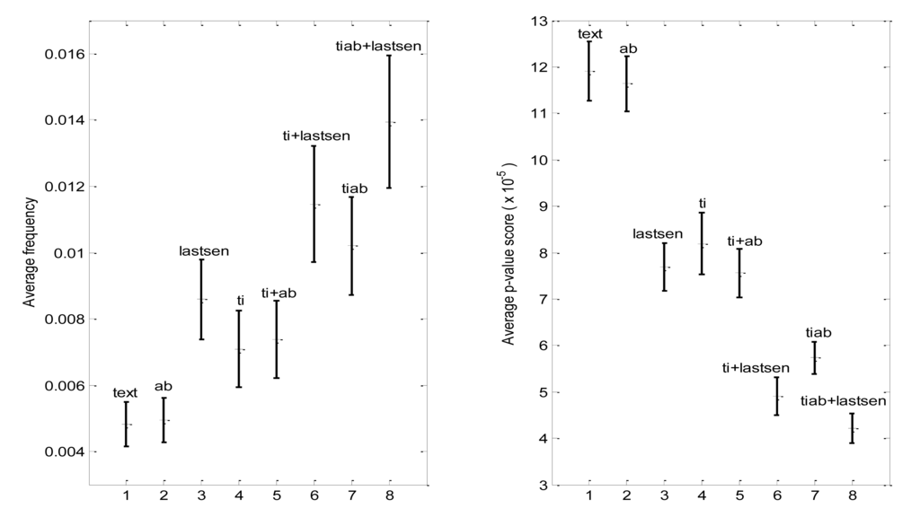 Regularized terms (tiab) that also appeared in the last sentence of at least one paper (tiab + lastsen) had the highest average frequency and lowest average p-value of all (Figure 5), suggesting that this subset of characteristic terms comprises, in some sense, the most important terms associated with the journal. Of the 20 characteristic terms having the lowest p-values overall in one journal, International Journal of Food Microbiology, all were found in the tiab + l astsen set as well. Thus, two independent methods—lowest p-value vs. presence in multiple sections of papers—agree in giving the most “important” characteristic terms.