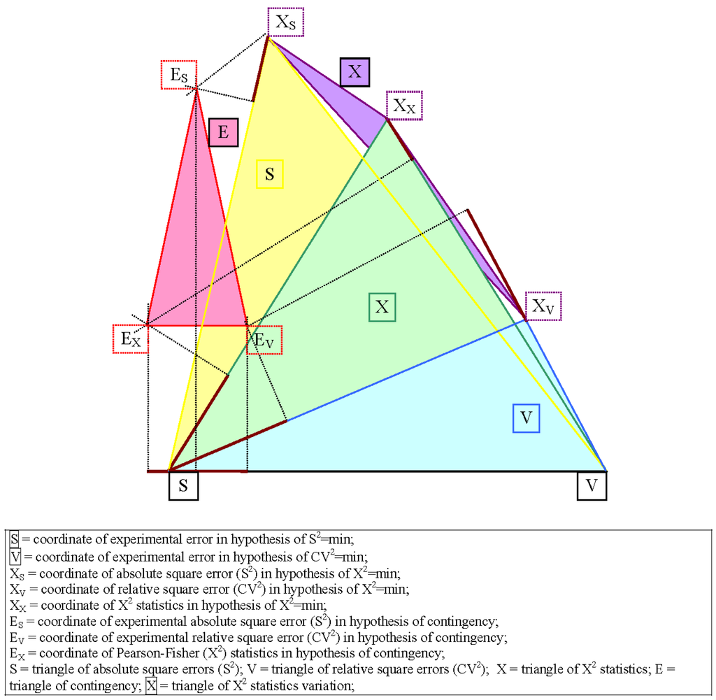 Figure 2 was obtained by setting the representation at the same scale of error area in ratio with two factors (the distance between the coordinate of experimental error for the hypothesis that S2 = min and the coordinate of experimental errors for the hypothesis that CV2 = min was used as reference). The coordinates for the hypothesis that X2 = min were obtained after maximizing the error area (maximization of the A, V and X triangle area). The coordinates of contingency were obtained so that its projections on the sides of the triangles could split the sides into the ratios observed among the differences in Table 7.