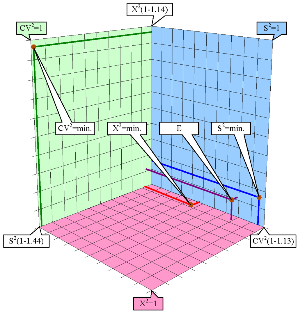 Figure 2 contains the representation of the relative values of errors (error excess) in the coordinates defined by the values of S2, CV2 and X2 for the results obtained through simple estimation (E, Equation (12)), minimization of the absolute square error (S2 = min, Equation (9)), minimization of the relative square error (CV2 = min, Equation (10)) and minimization of the X2 statistics (X2 = min, Equation (11)).