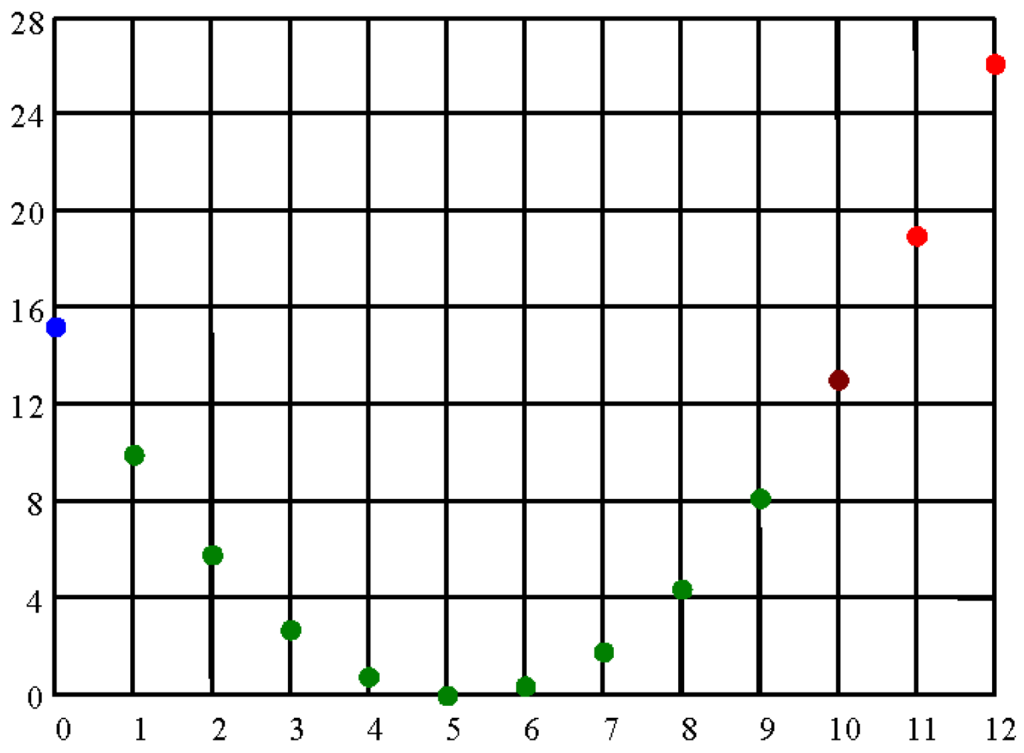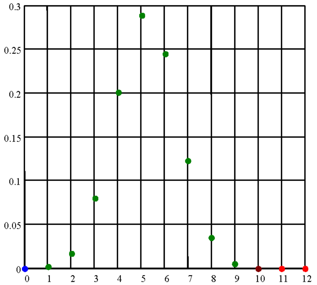 Figure 4. Value of the statistical probability of the observed according to the observable.If higher distances from homogeneity than the observed strictly in the sense of the observed gives the statistic, then the probability associated to observation is obtained by cumulating the probabilities for x = 10, x = 11 and x = 12 (red dots on Figures 3 and 4).