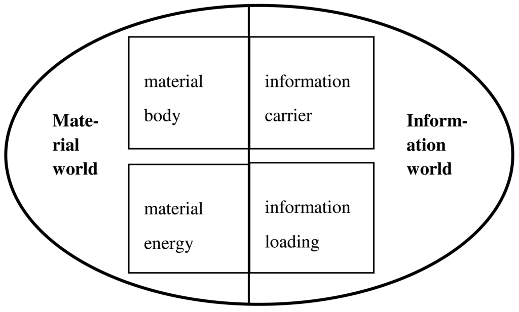 In other words, this textbook aims to represent the information world in a new way, grounded on Newton's view towards the material world, by introducing the mutual connection and interaction between the information world and the material world. Firstly, being relatively independent from the material world, the information world exists in the sense of existing-in-itself, doing-for-itself, being consistent within its self and being self-proliferating. Secondly, information has contact with a material body through an “information carrier”, and interacts with physical energy through “information loading”. See Figure 2 [2].