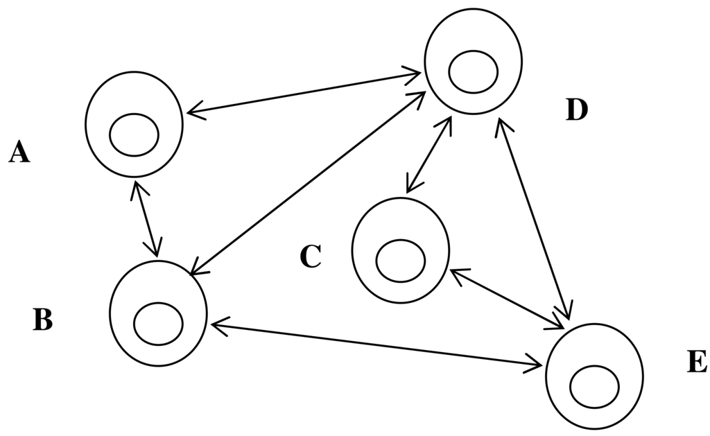 From the very beginning, human society is a society filled with information. At first, only simple information tools existed. Our “living world” is a network of humanistic information which is composed of “informational man”, see Figure 8. A small living world consists of five people: A, B, C, D, and E. Solid lines with double arrows indicate communication between people. In the era characterized by the popularity of “the Internet”, with the help of a global computer network in a wired or wireless way, the worldwide “informational men” have constituted a super multi-layer and complex information network. With diminishing importance of contact on a “physical level”, there is more and more significance in terms of “psychic contact”. The contact and communication between people in a material sense have almost been “informationized” (or “virtualized”).