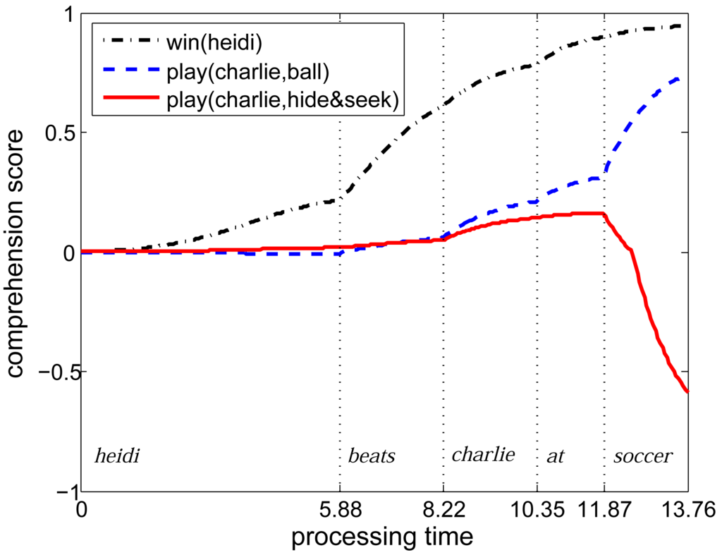 Figure 1 shows comprehension scores during processing of the sentence heidi beats charlie at soccer for three atomic situations of interest. The first of these, win(heidi), is literally asserted by the sentence. The second, play(charlie, ball), is not literally asserted but, by applying microworld knowledge, can be inferred from what the sentence claims. The third, play(charlie, hide&seek), is inconsistent with the situation described by the sentence because Charlie cannot be playing both soccer and hide-and-seek.