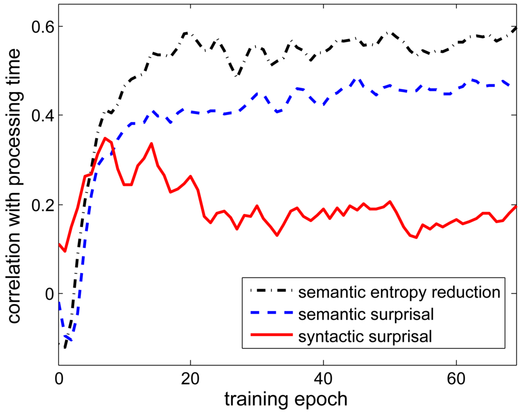 Figure 2 shows the correlation coefficients between word-processing times and the remaining three information measures, over the course of network training. Note that the network appears to become sensitive to syntactic patterns early in learning, before semantic information has much of an effect. Later, the two semantic information-measures dominate, and the effect of syntactic information diminishes. It is clear that each information measure correlates positively with reading times: Words that convey more information, be it syntactic or semantic, take longer to process. For syntactic information, this is in line with much experimental data [36,41–47]. For semantic information, this result is what we would expect considering that the network is engaged in semantic (more than syntactic) processing. Also, several psycholinguistic experiments [28–31] have shown that reading times are indeed longer on words that are less appropriate considering the state-of-affairs being described and that can therefore be considered semantically more informative.