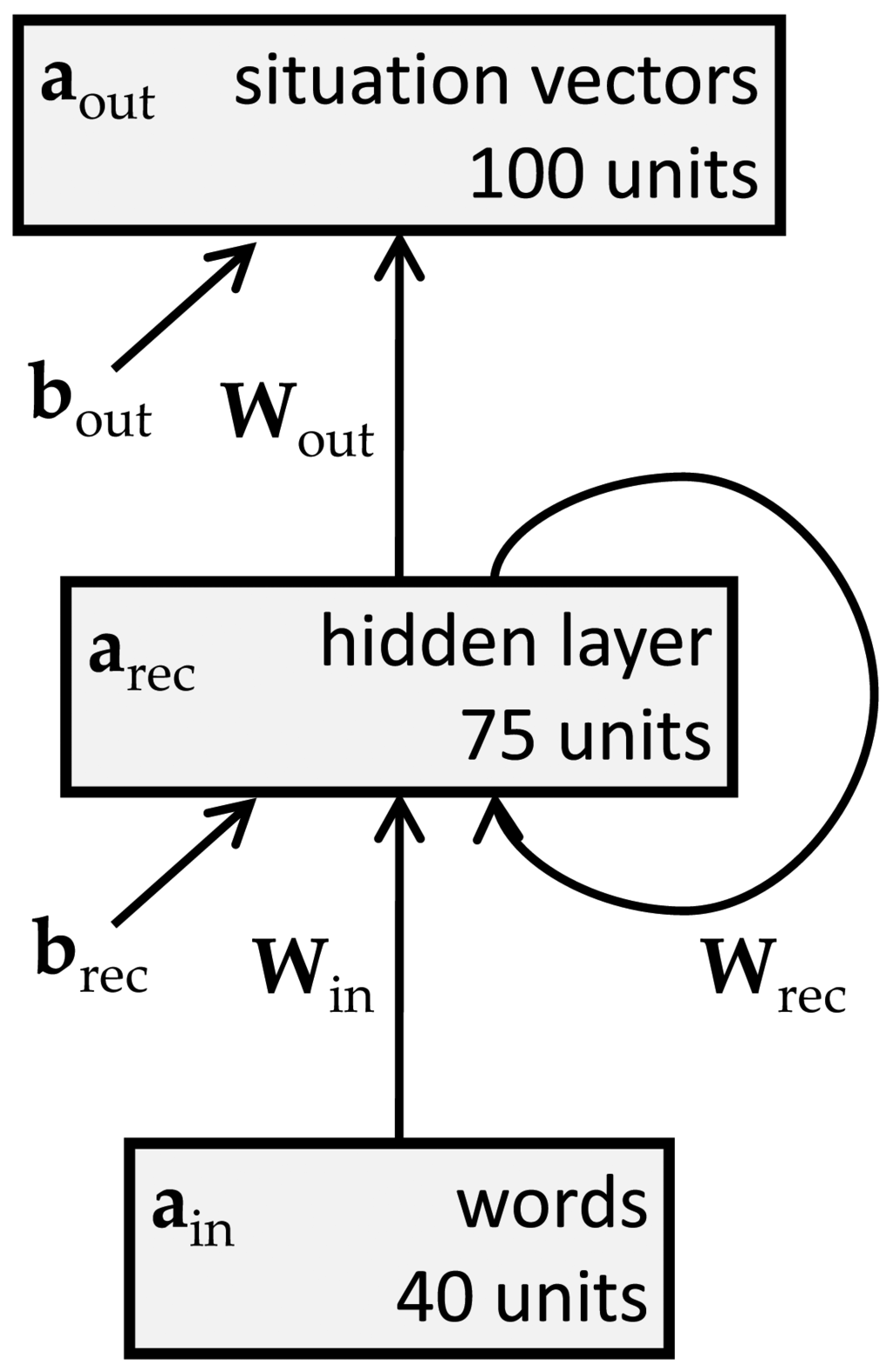 Comprehension of a microlanguage sentence is modeled as the process of mapping the sentence onto the vector representing the described microworld situation. This mapping is learned and performed by a Simple Recurrent Network (SRN) [33]; a standard connectionist architecture for incremental sentence processing that has been used to account for a variety of phenomena in human language acquisition and comprehension ([5–7,34–37]). The network has a three-layer architecture (see Figure B1 in Appendix B), with one input unit for each word in the microlanguage, one output unit for each dimension of situation space, and a number of hidden units that is fairly arbitrarily set to 75. When a sentence that describes microworld situation p has been processed, the network's output ideally equals p's vector representation μ(p), which therefore forms the target output when the network is trained on that sentence. Before the sentence is completed, the output should reflect what is described so far. That is, if p, q, r, … are all the microworld situations consistent with the sentence-so-far, the network's output vector ideally equals μ(p ∨ q ∨ r ∨ …), expressing the disjunction of all situations that are not yet excluded by the incoming sentence. During network training, however, the target output is μ(p) from the very beginning of the sentence.