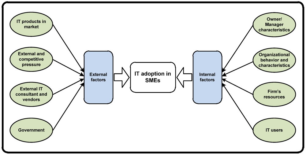 Within this study and as suggested in Figure 1, influencing factors are categorized into two major clusters of factors and their subcategories: internal and external factors. In addition, a brief review and categorizations of factors influencing IT adoption in SMEs have been offered in Table 1: factors that are merely SME-related. Internal factors are defined as factors within the technological context and organizational context of SMEs. Technological context describes the internal technologies relevant to the firm. Organizational context refers to descriptive measures regarding the organization, such as firm size and scope, managerial structure and internal resources. External factors, however, refer to the factors within the environmental context that describe the arena in which a firm conducts its business: its industry, competitors and dealings with government [28,29,30].