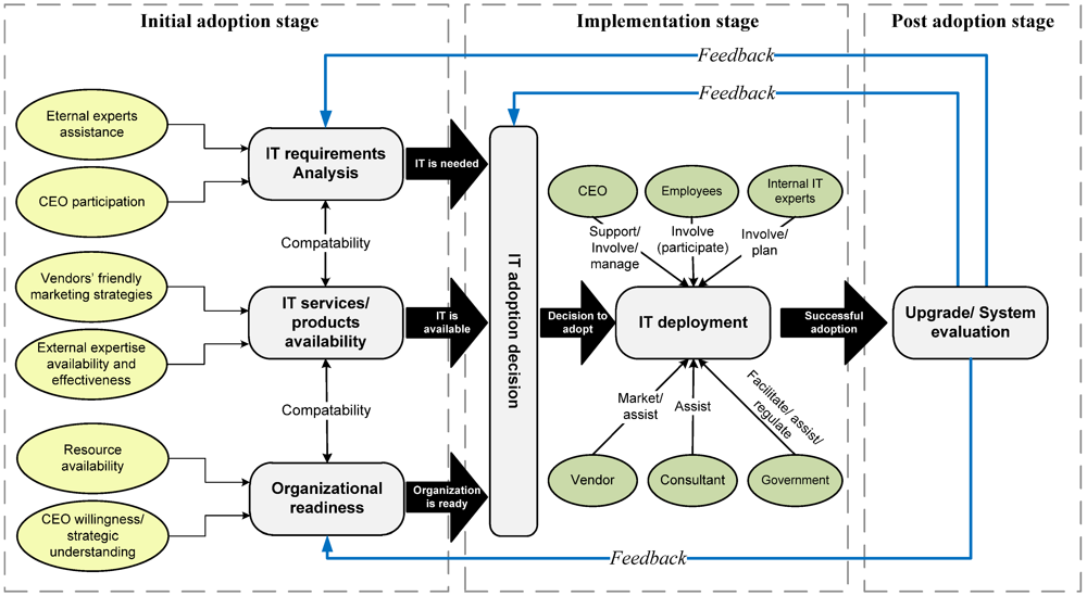 Another influencing factor attributable to the organizational characteristics is IS/IT planning. Through IS planning, the chance of successful implementation of IS within small firms might be higher [21]. IT planning means that SMEs should determine why and how IT can enhance their business processes and profitability, and then develop a strategy and objectives to obtain the anticipated results [52]. SMEs owners/managers should assign the resources and dedicate significant time and attention to manage the adoption process [78]. They must understand that IT, requiring long-term commitment and sizeable investment, as well as having high strategic importance, can have a significant influence over organizational capacity, validity and survival. Planning of IT is perceived to be even more essential with regard to the speed at which technological innovations take place, along with the continuous efforts required by the SMEs’ internal environments to absorb them [21]. Therefore, SMEs can fully benefit from adoption of IT through IT planning to evaluate the threats and opportunities created by IT [9]. In addition, IS planning in SMEs, requiring integration with business strategy, has become more crucial as IS becomes more central to the future success and growth of SMEs and business strategy and IS strategy become intertwined [123]. When IS/IT adoption is not planned strategically, for example when SMEs invest in IS with the aim of only improving production processing without integrating other systems, IT-based competitive advantages are typically accidental rather than planned [49]. According to the literature, IS planning includes five phases; financial resources planning, human resources planning, information requirements analysis, implementation (software development, installation, and conversion) and post implementation (operation, maintenance, future needs) [124]. In addition, a review of IT adoption literature by Ayman et al. [125] places emphasis on IT projects management and argues that “highly regarded IT projects can be badly delivered if they are not properly managed”. Accordingly, a short-term strategic decision making cycle and lack of planning in some SMEs may bring about particular problems in implementation of IT [9,126]. Although it is generally believed that barriers to IT adoption arise mostly out of inaccessibility to funds and technology, the major barrier to IT adoption among US small business is the lack of an information system plan [127].