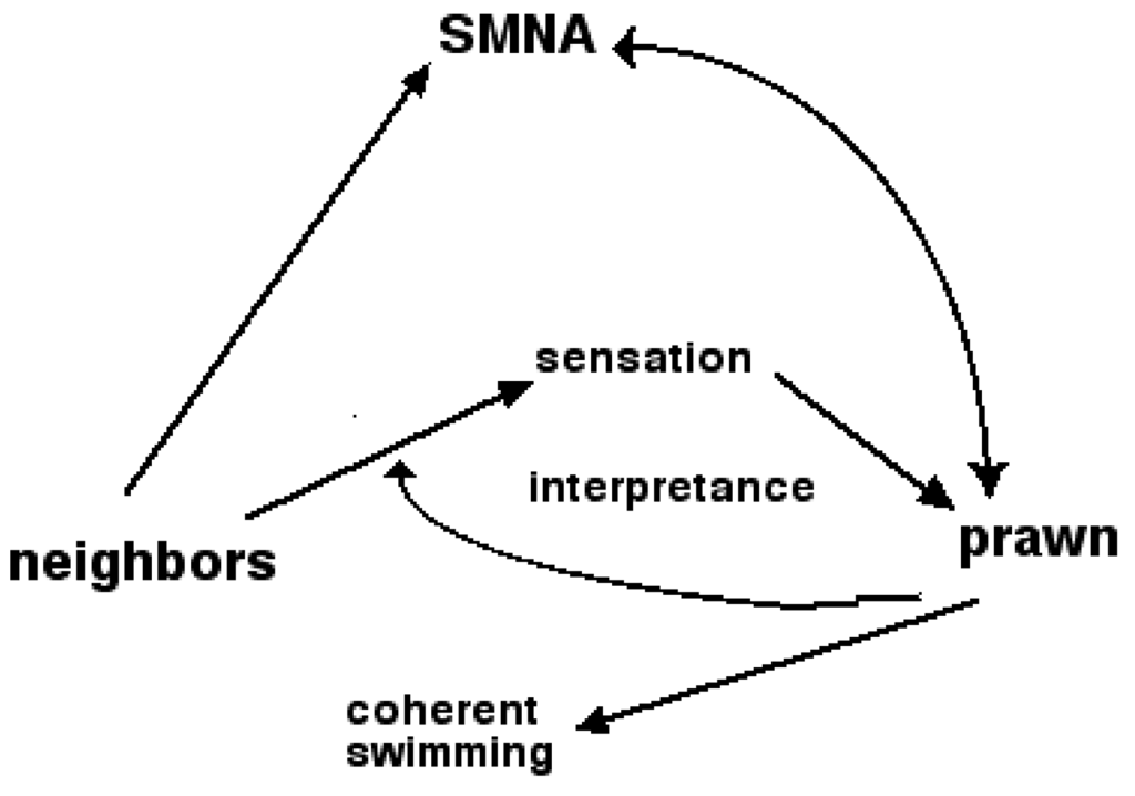 Peircean triadic diagram of semiosis. Neighbors are the object, short-term memory--now--anticipation (SMNA) the sign, the prawn is the system of interpretance []. Interpretance here labels the innermost cycle, within the prawn. Arrows indicate direction of information flow. Meaning emerges as coherent swimming.