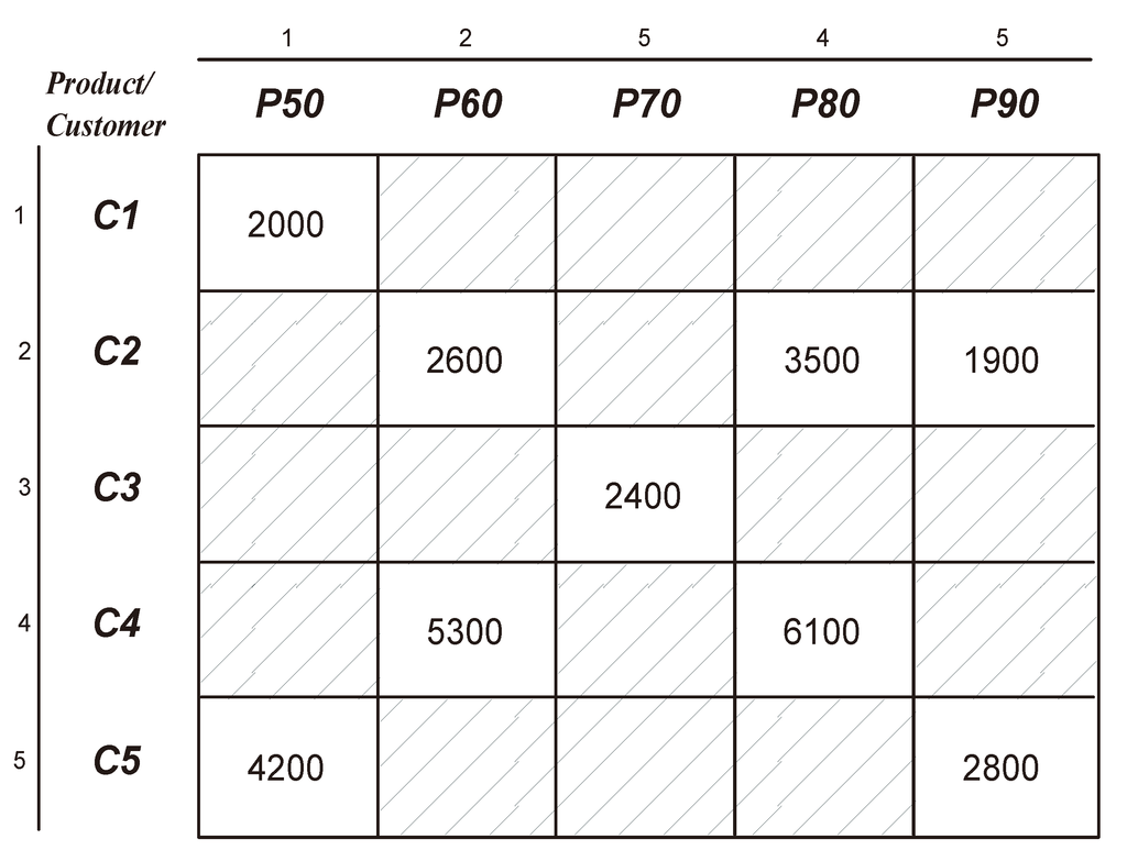 In this section, we detail the bitmap compression method used in MOLAP by presenting a simplified example consisting of a two dimensional array. The dimensions representing the indexes of this array are respectively products and customers, and the values represent sales amounts, each of which is a fact fora specific customer anda specific product. Figure 1 shows the original non-compressed matrix (two-dimensional array), in which null values are represented by dashed cells.
