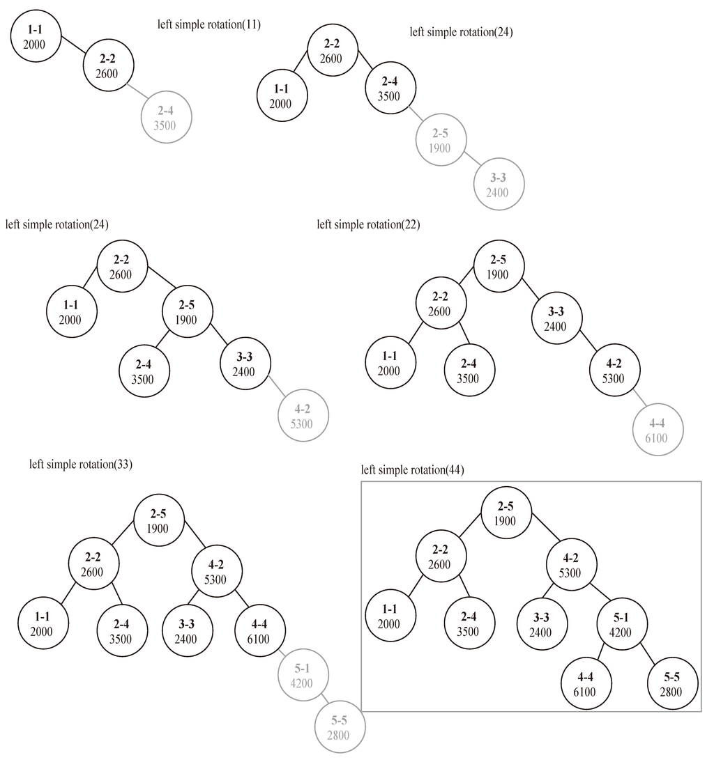 To overcome the lack of time complexity in the worst case scenario, we choose to use a balanced binary search tree instead of a classical one. For this reason, we choose the AVL tree structure [12]. Inserting a node into an AVL tree is a two-part process. First, the item is inserted into the tree using the usual method for insertion as in a binary search tree. After the item has been inserted, it is necessary to check that the resulting tree is still balanced. A tree is considered balanced if for any node of this tree the height of its left sub-tree differs from the height of its right sub-tree by at most one level. This difference is called the balance factor of that node. When the tree becomes unbalanced, a single or a double rotation to the left or to the right has to be applied to the tree in order to re-balance it.