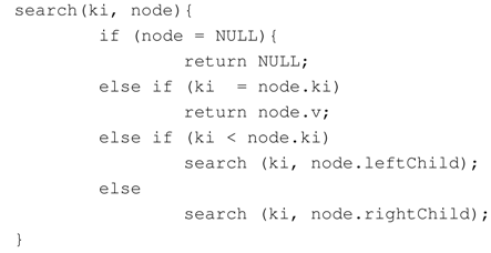The search algorithm takes as first parameter a key index ki, which represents the indexes of the searched cell (normally a cell that has a value “1” in the bitmap multidimensional array), and the current node “node”, which is initiated to the root at each external call. If the searched key index ki is found into a node in the BST, then the algorithm will return the value v from this node.