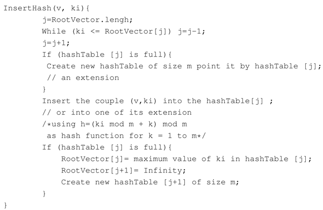 Inserting data will always take place into the hash table pointed by a critical key that is greater than or equal the key index of the data to be inserted. The initial and last cell value of the root vector will be always the infinity value. This insertion method will generate values in the root vector in ascending order, where each value of this vector will finally point to a hash table containing keys less than or equal to it.