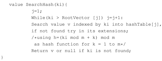 To search a value having a key index ki, the search will start into the root vector by comparing the value of the index key consecutively with the values of the root vector until reaching a value greater than or equal ki [16]. In the worst case, the last infinity value will be greater than ki. Once this greater or equal value is found, the hash table pointed by its case (numbered as its index) will be elected as containing the searched key. Thus, the search will take place only into this hash table of size m and probably in its extensions if they exist. The same hash method used during insertion will be applied in order to find the key location within the elected hash table.