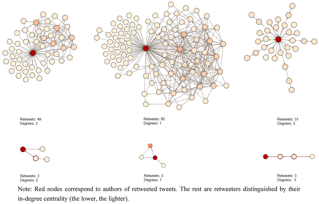 A total of 13,946 and 20,278 social subgraphs of follower/following relationships were made (see some examples in Figure 1) and, for each one, we calculated the eccentricity of the tweeter’s tweet (i.e., the longest geodesic connecting each tweeter with the set of the retweeters of his/her tweet). Remarkably, the social distances traveled by retweeted tweets are in the same range found for other phenomena in literature on social contagion (see Table 4).