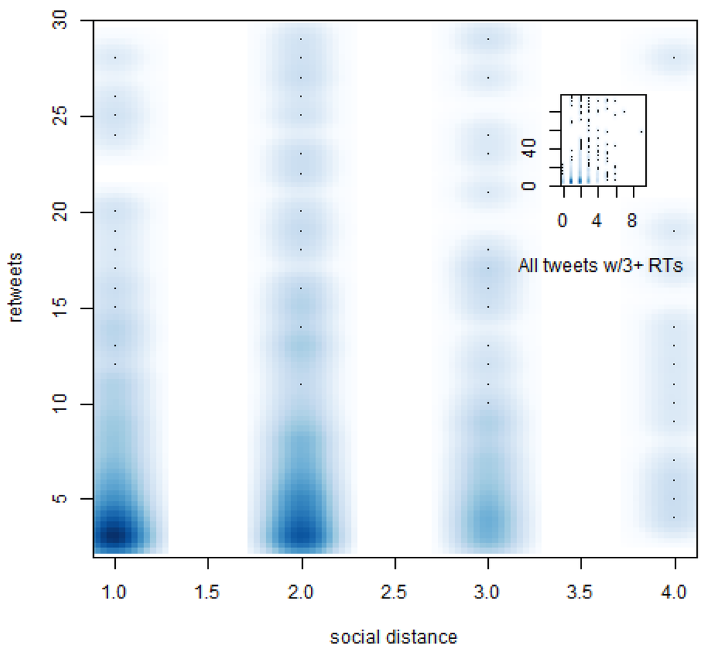 Density plot of social distance travelled by retweeted tweets by number of retweets (10-day sample).