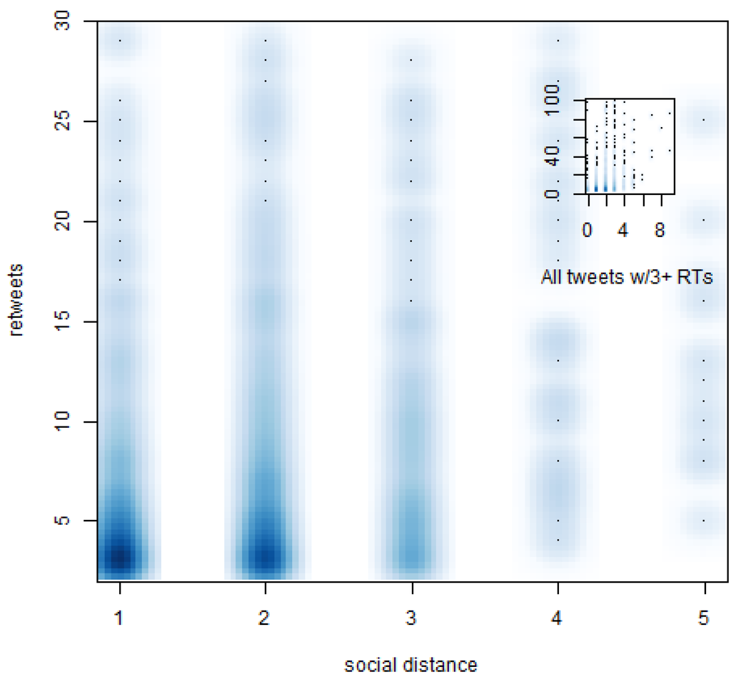 Density plot of social distance travelled by retweeted tweets by number of retweets (1-day sample).
