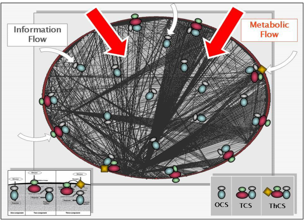 Let us underscore that important fact: all biological systems, and all societies, are organized by putting together networks of communication and networks of self-production processes, always mixing them, interconnecting them. If living beings scan their environment and communicate with each other, it is in order to fulfill their needs and advance their life cycles. “Reading” the environment becomes prior to “eating” it (i.e., whatever is ingested from the outside has been previously detected and inspected by the sensory systems), and it is obvious that the respective energetic and communicational inputs are treated quite differently. Herein, we will explain in detail how both kinds of openness are organized—intertwined—in some of the simplest living organisms: prokaryotic cells. Further, we will argue that the meticulous integration of both kinds of processes is precisely the only way to arrange a complex organization, either molecular, or cellular-organismic, or social. Communicative flows have to infiltrate the material flows of self-production processes and guide them, and also the vice versa.