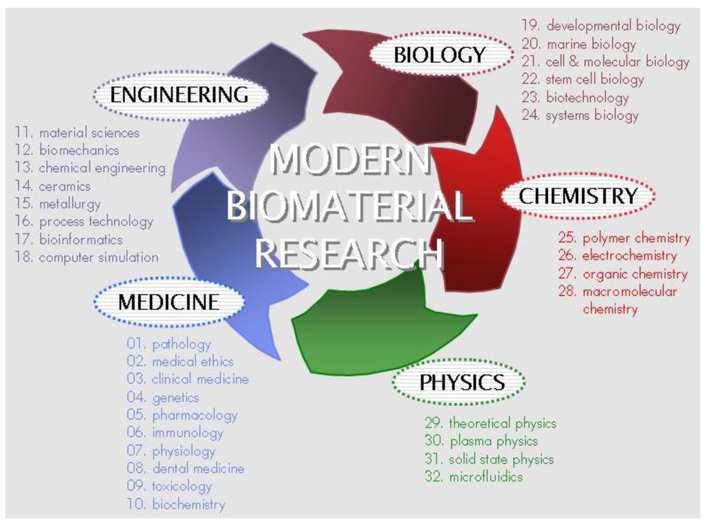 Disciplines involved in modern biomaterial research. The representation is based on the description made by bioengineer J. Kirkpatrick [
