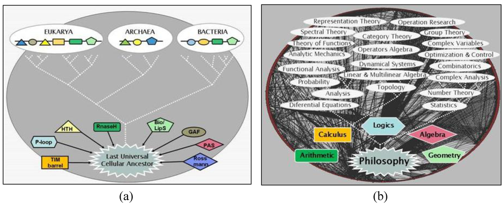 Parallel between recombination events in the evolution of the protein universe and in the evolution of the sciences. (a) The “big bang” of protein universe; (b) Subdisciplines of mathematics (Modified from [