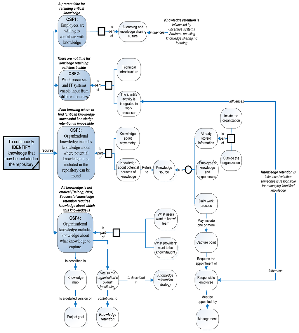 - CSF4: Organizational knowledge as the critical basis for understanding what knowledge to capture, i.e., what knowledge is critical from a knowledge retention perspective.