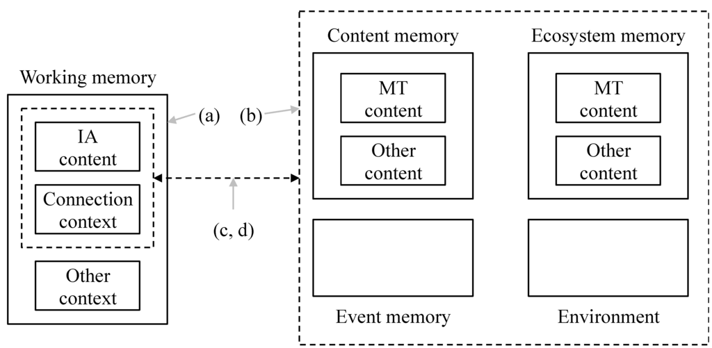 MfI includes a generic model for IEs that incorporates different types of memory. Humans have semantic memory and episodic memory [7]. Computer databases include symbolic records and also binary large objects (things like media files). For IEs in general we use the terms symbolic memory and event memory to distinguish between these two types. In addition, IEs have working memory where connections are made in response to interactions.