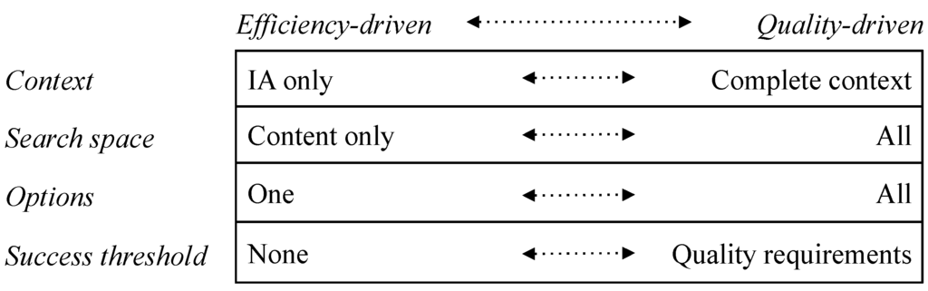 The option factor is straightforward—does the IE just accept the first match, or require several, or all. The success threshold defines what constitutes a match—is there a quality standard that needs to be met in terms of the nature of the connections or related to derivation. This is clearly related to Action IQ. An element of the success threshold is coherence. The importance of coherence for an IE is clear—without a coherent interpretation of the environment it will not be possible effectively to evaluate courses of action (and their potential relationship with outcomes). In [8], Kahneman describes how “associative memory, …, continually constructs a coherent interpretation of what is going on in our world at any instant”. As Kahneman makes clear, coherence is not necessarily linked to other aspects of quality.