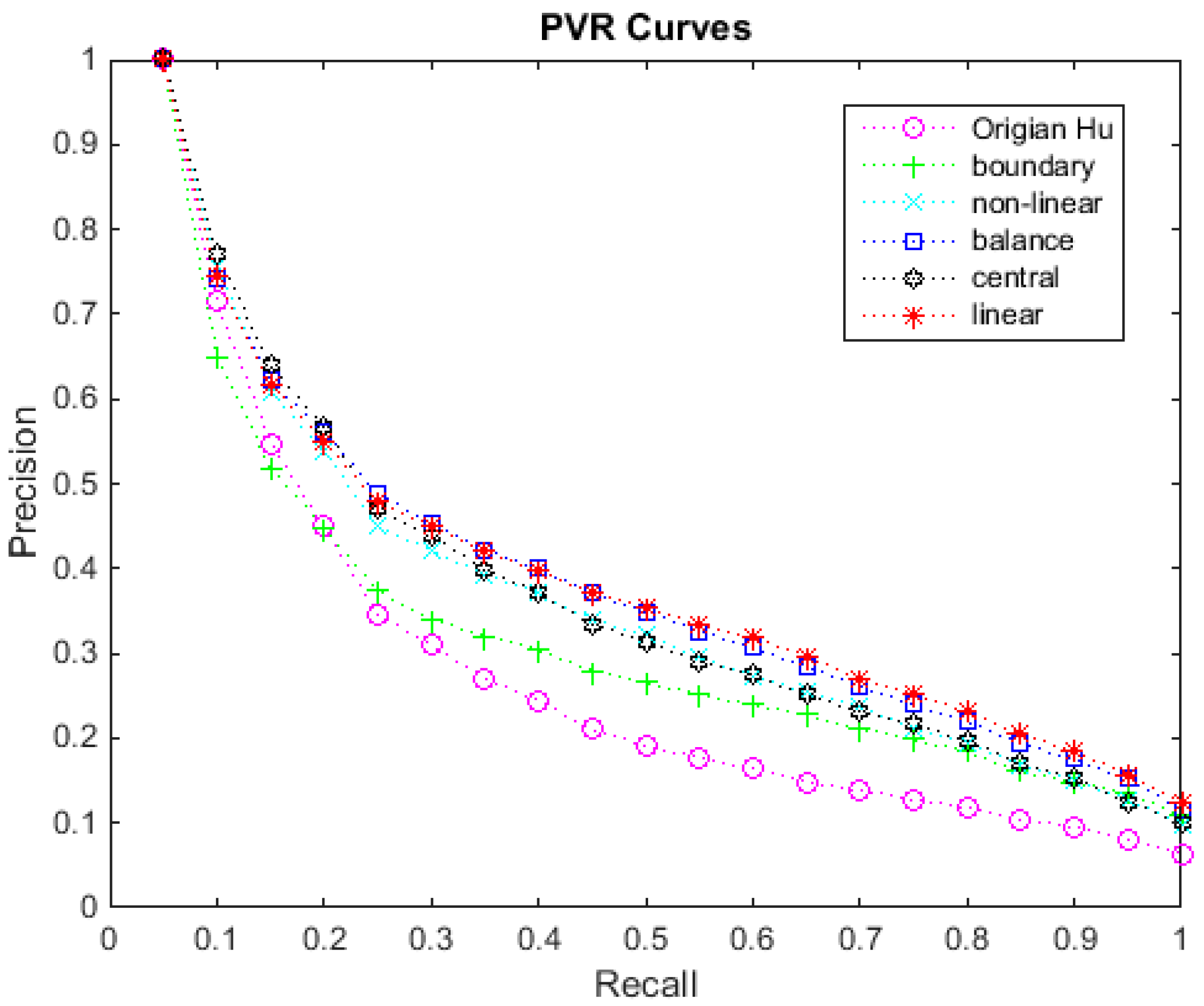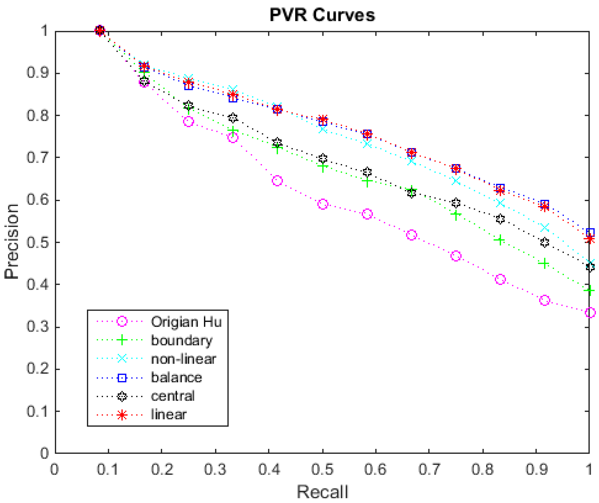 It is clear from the average precision and recall curves that the modified Hu moment invariants based on the linear weighting function, non-linear weighting function, balance weighting function and central weighting function can get better retrieval results compared with the original Hu moment invariants and the boundary moment invariants. In addition, the boundary moments outperform the original Hu moments, but underperform when compared to the improved Hu moments based on other weighting functions. Thus, the weighting scheme for the central moments defined in this paper is effective in identifying different 2D shapes.