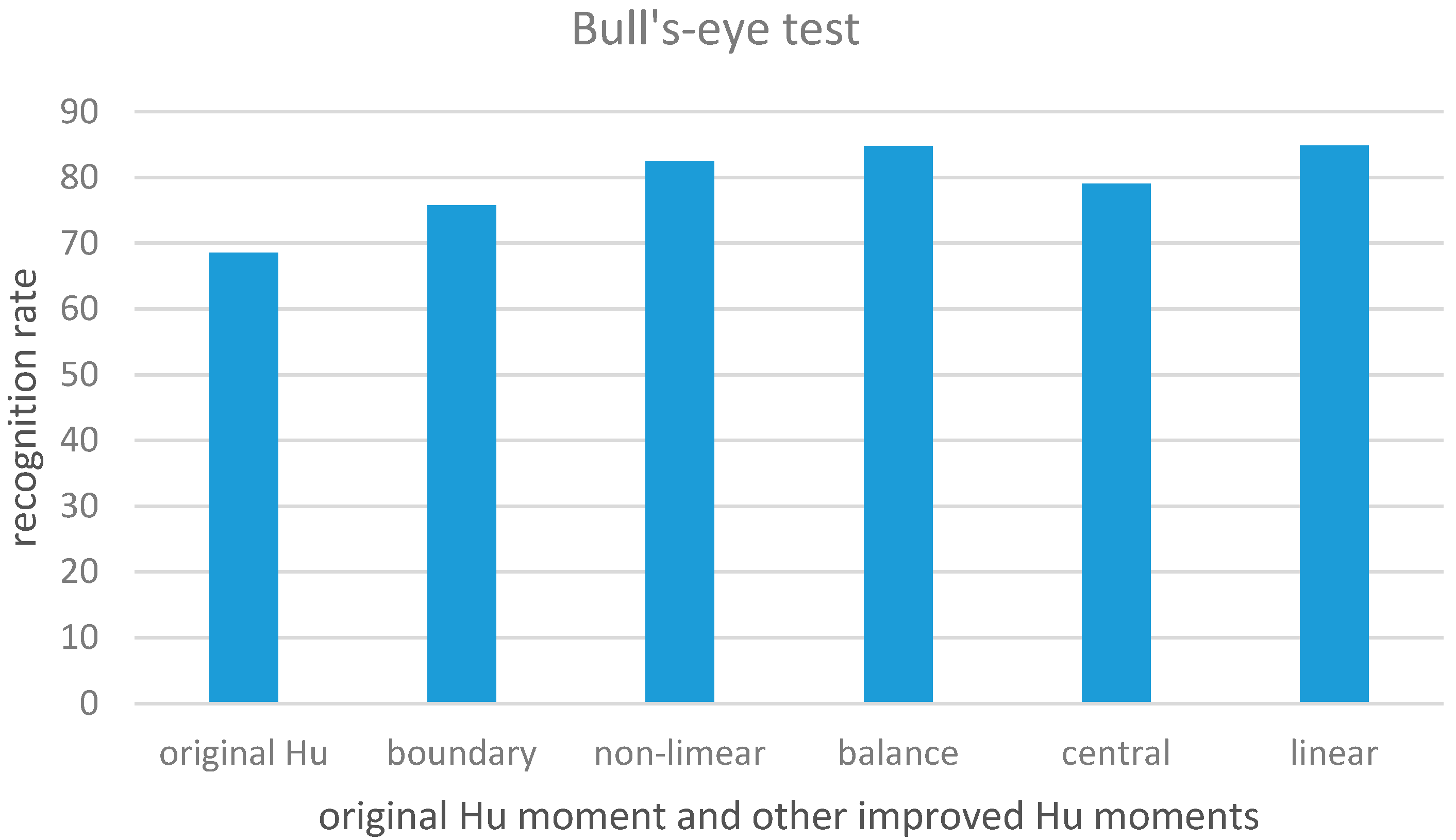 The bull’s-eye test is selected as another evaluation criterion in the experiments as well. In the bull’s-eye test, each shape is used as a test query. Retrieval is considered correct if it is in the same class as the query. Figure 4 and Figure 5 show the bull’s-eye test results on Kimia’s shape datasets and MPEG-7 shape datasets, respectively. All of the improved approaches can get a better retrieval performance compared with the original Hu invariant moments, especially the two improved Hu moments based on central moments with the balance weighting function and linear weighting function.