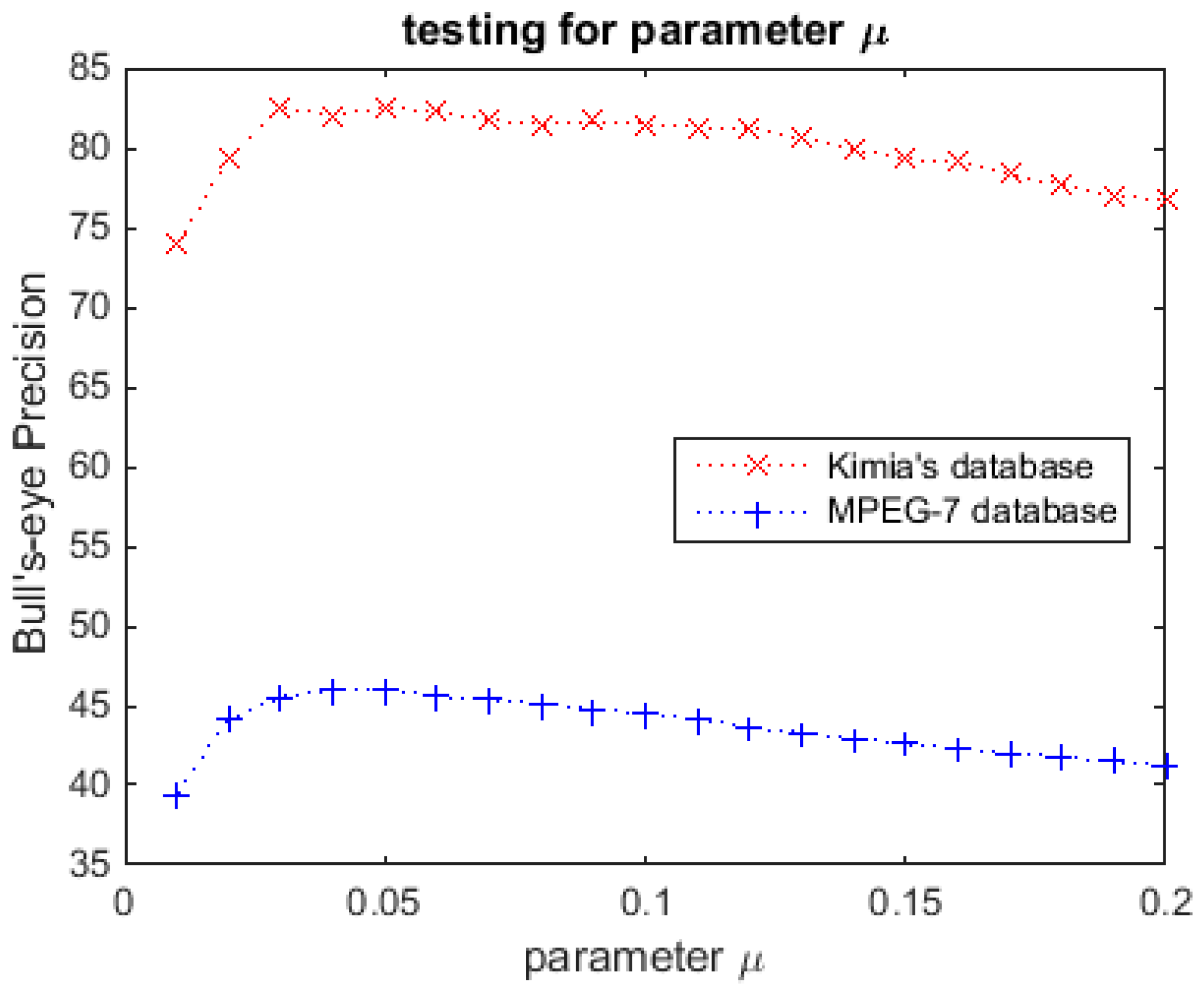 Several weighted central moment approaches have been presented in Section 3. From Equations (15), (17) and (18), it is clear that the nonlinear weighting function has two parameters that should be carefully set ( is set to 0 in all experiments), and that both the balance weighting function and central weighting function have one parameter that should be carefully set as well. It is necessary to discuss the influence of different parameters on the retrieval performance. Figure 6, Figure 7 and Figure 8 show the details of the influence of different parameters on the retrieval performance on Kimia’s and the MPEG-7 shape database. As for parameters and , they should be set around 0.03 so that the performances are optimized. Additionally, parameter should be set around so that the performances are optimized.