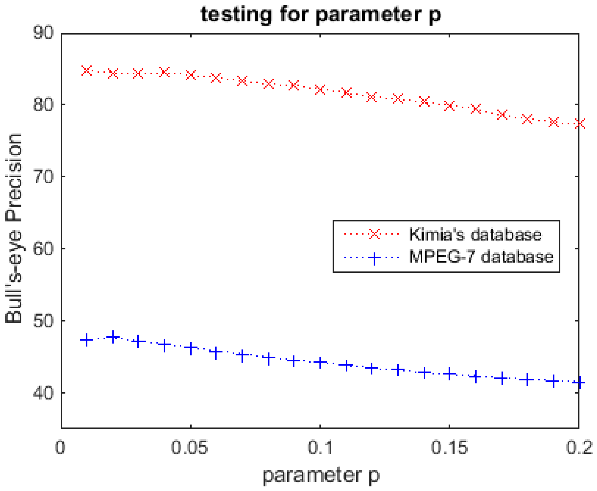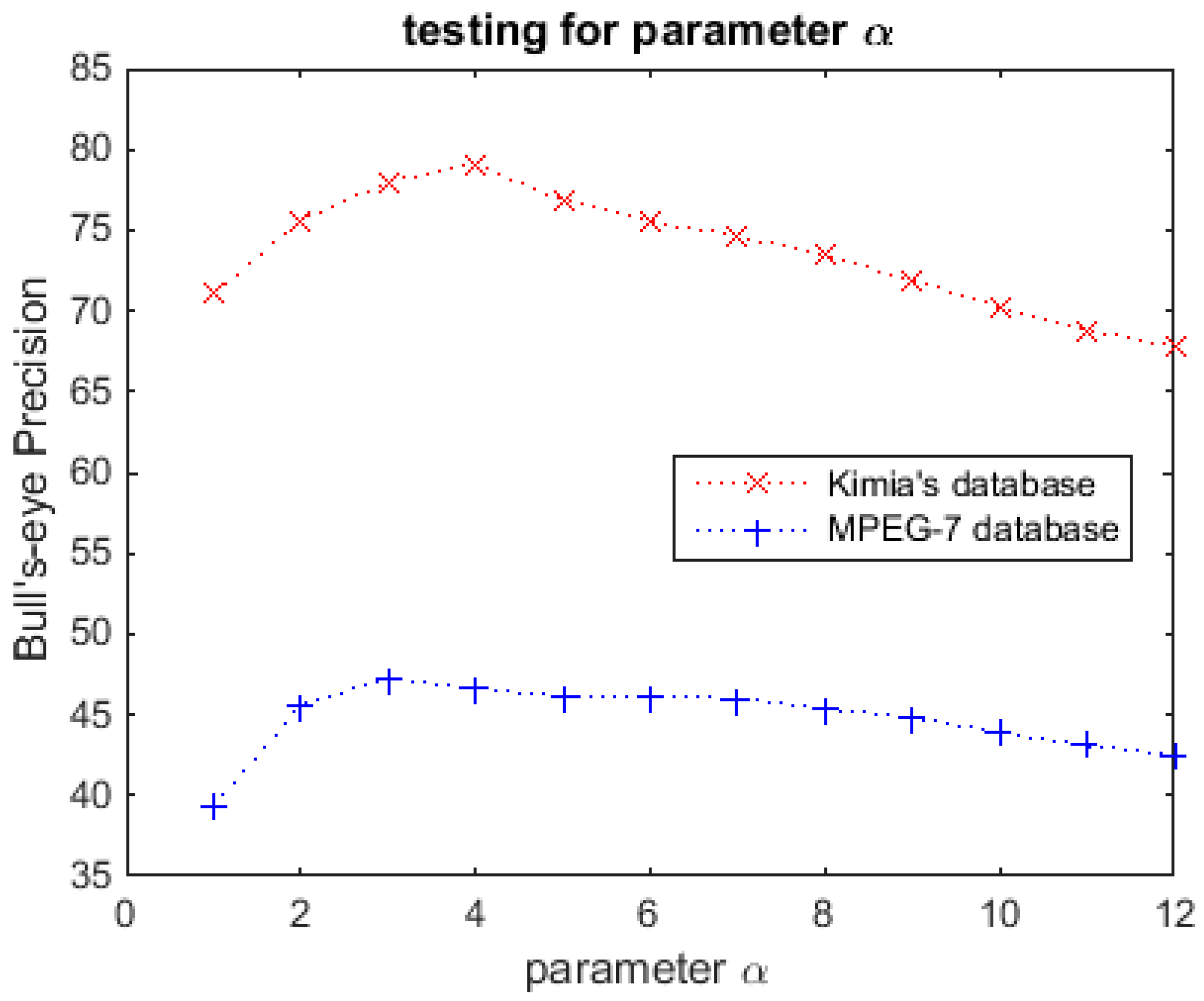 In order to obtain good performance, the parameters are hand-picked. In Kimia’s shape database, parameter for the non-linear weighting function is set as 0.05, parameter for the balance weighting function is set as 0.01, and parameter for the central weighting function is set as . In the MPEG-7 shape database, parameter for the non-linear weighting function is set as 0.05, parameter for the balance weighting function is set as 0.02, and parameter for the central weighting function is set as . There are no parameters for the other weighting functions.