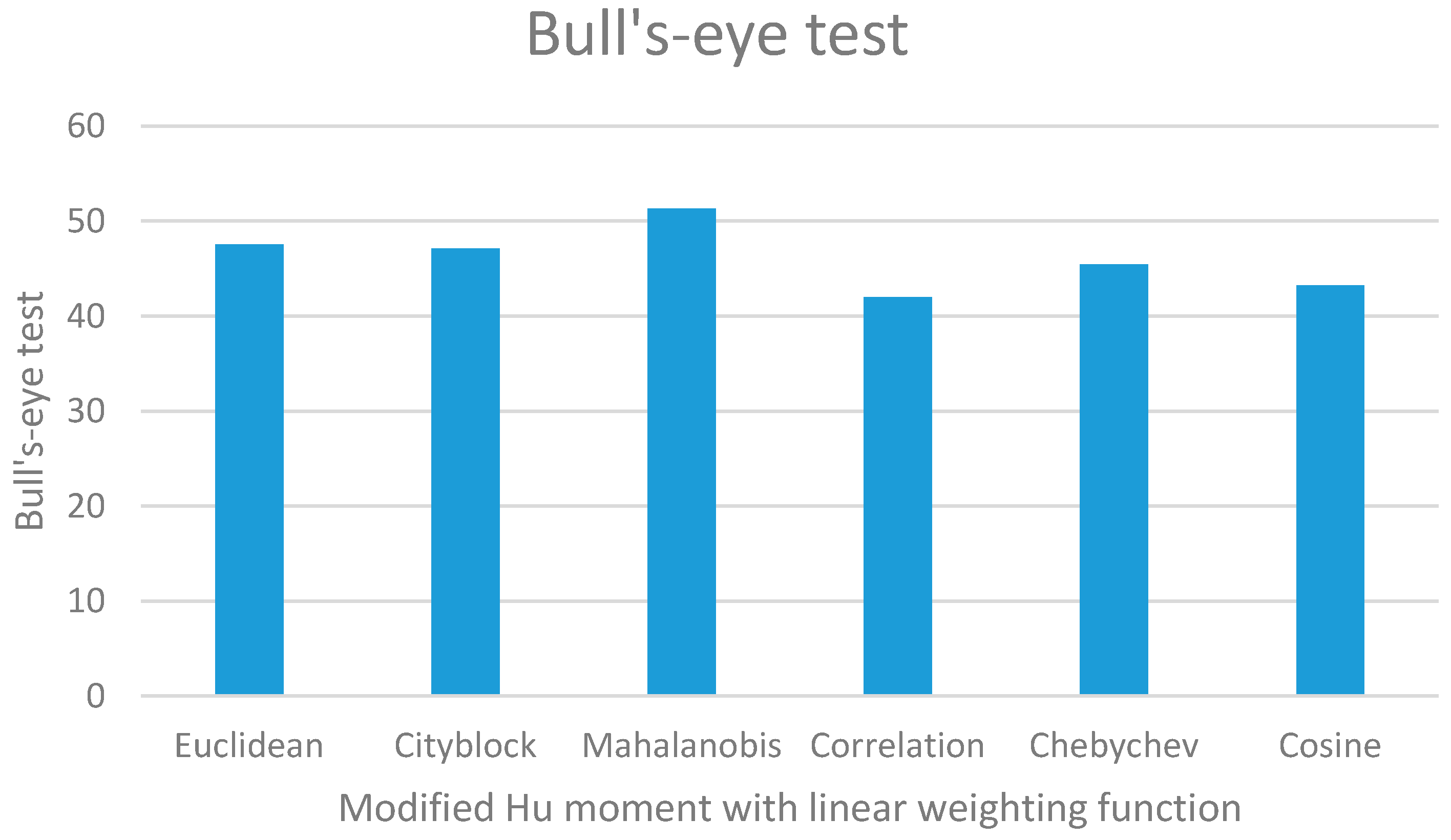 We have tested the original Hu invariant moments and other improved Hu moments in the above sections. The original Hu invariant moments assign identical weights to all of the pixels within an object, including the boundary pixels. This leads to their relatively low performance. For reducing the computations, Ref. [17] considers only the pixels on the shape boundary. Thus, the weights of the pixels on the contour are set to 1, and the weights of the inner pixels are set to 0. Compared with the original Hu invariant moments, Ref. [17] achieved better results. Other weighting approaches take all the pixels of an object into consideration and assign different weights to different pixels according to some rules. This brings us more robust results. The central weighting function assigns larger weights to pixels close to the center-of-mass and this gives favorable results. However, this approach may be disabled when the center-of-mass of an object is located outside of the object boundary. According to human perception, the boundary weighting approaches (Equations (14) and (15)) emphasize the region near the object boundary and allocate heavy weights to the pixels close to the object boundary. This modification makes the performance more robust. The balance weighting method shares the merits of both the central weighting function and the boundary weighting function. If parameter is selected carefully, a better performance will be obtained. In addition, compared with other weighting functions, the weighting function of Equation (14) does not need any parameters and can obtain respectable results.