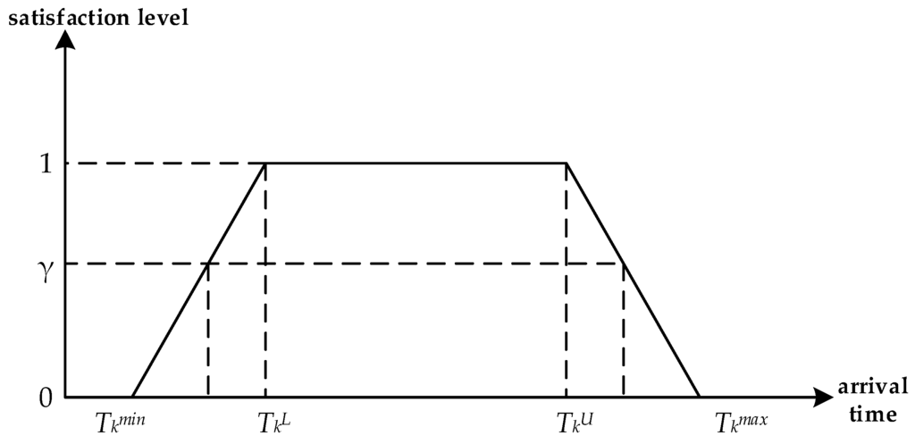The membership function of the time window is as Equation (1), where is also the customer satisfaction level when commodity k arrives at its destination at .