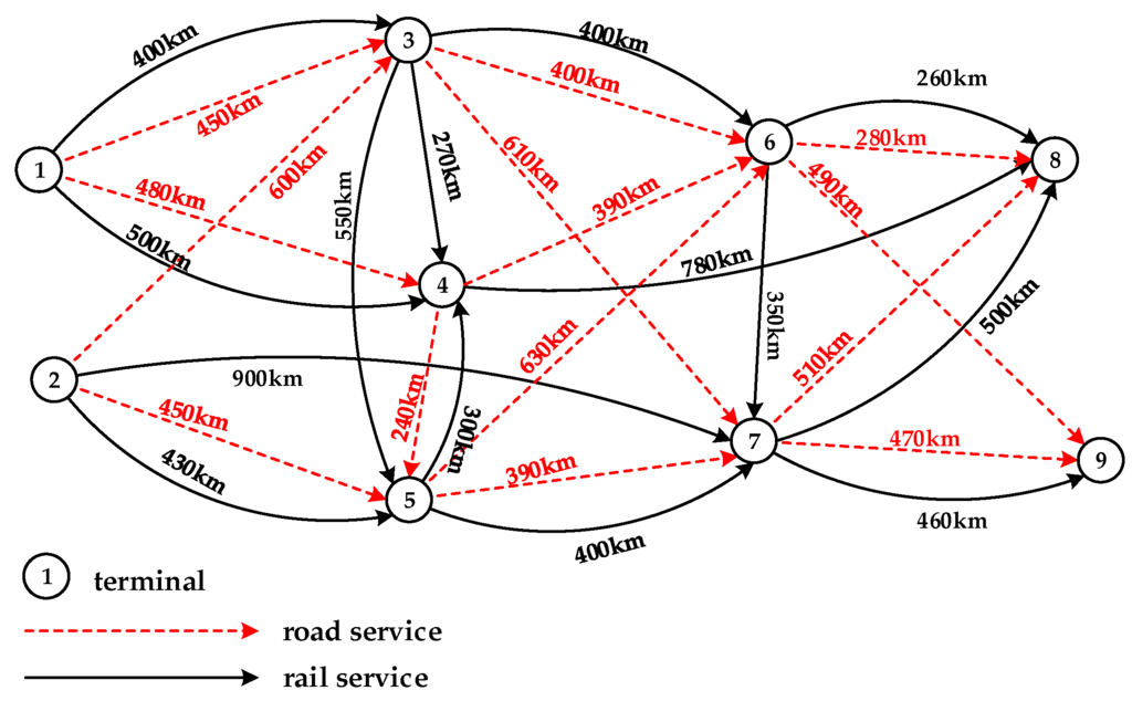 Similar to the transportation scenario constructed in Reference [1], the rail service (the schedule-based service) in the multimodal service network specifically refers to the “point-to-point” block container train service. This kind of service is operated directly and periodically from its loading organization station to its unloading organization station. For the convenience of modeling, the same block container train in different periods is treated as a different one. The road service is formulated as an uncapacitated time-flexible service, which matches the superiority of the road service (container trucks) in its organization flexibility. Transshipment is not necessary when the commodity arrives at and then departs from a terminal by road service, and a road service route can be covered entirely or partly in the routing. For the convenience of modeling, a road service can be divided into several segments, e.g., a directed road service route (g, h, i, j) is divided into sub segments (g, h), (g, i), (g, j), (h, i), (h, j), and (i, j).