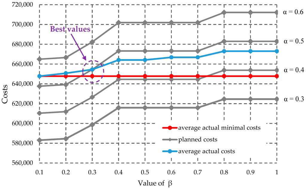 As we can see from Figure 5: (1) when confidence level α is given, larger values of confidence level β will lead to larger planned costs, and the increase of the planned costs is stepwise. Similarly, when confidence level β is given, larger values of confidence level α will also lead to larger planned costs, and the increase of the planned costs in this situation is linear; (2) The actual costs are only related to confidence level β. The values of confidence level α do not influence the actual costs. Similar to the variation of the planned costs, larger values of confidence level β will lead to larger planned costs, and the increase of the actual costs is stepwise; (3) The actual minimal costs is not related to confidence level α and confidence level β.