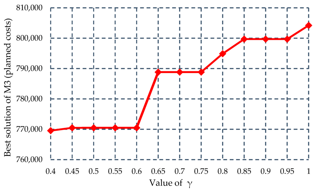 As we can see from Figure 6, considering a reasonable customer satisfaction level range, when the customer satisfaction level is lower than 0.6 (γ < 0.6), its variation has only a slight influence on the multicommodity multimodal routing. However, when γ ≥ 0.6, Figure 6 shows that larger values of confidence level γ will result in a larger value of the total generalized costs of the routing, and the increase of the total generalized costs is stepwise. The sensitivity analysis above clearly indicates that restricting the multicommodity multimodal routing to meet stricter customer satisfaction levels will increase the costs of the multimodal service network system to some degree, which is logical according to practical experience.