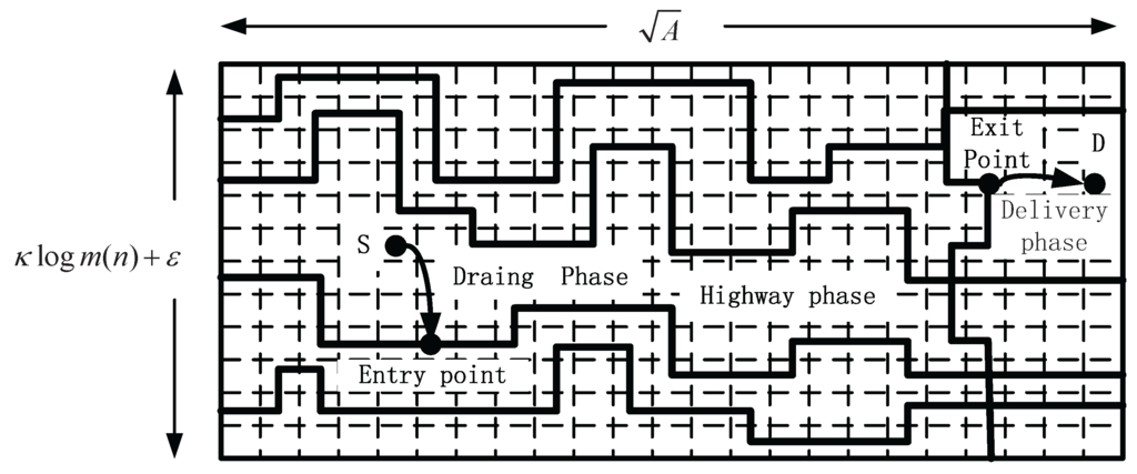 - Highway phase: In the highway phase, packets are first moved along horizontal highway, and then along the vertical highway until they arrive at an exit point that is close to the destination node D.