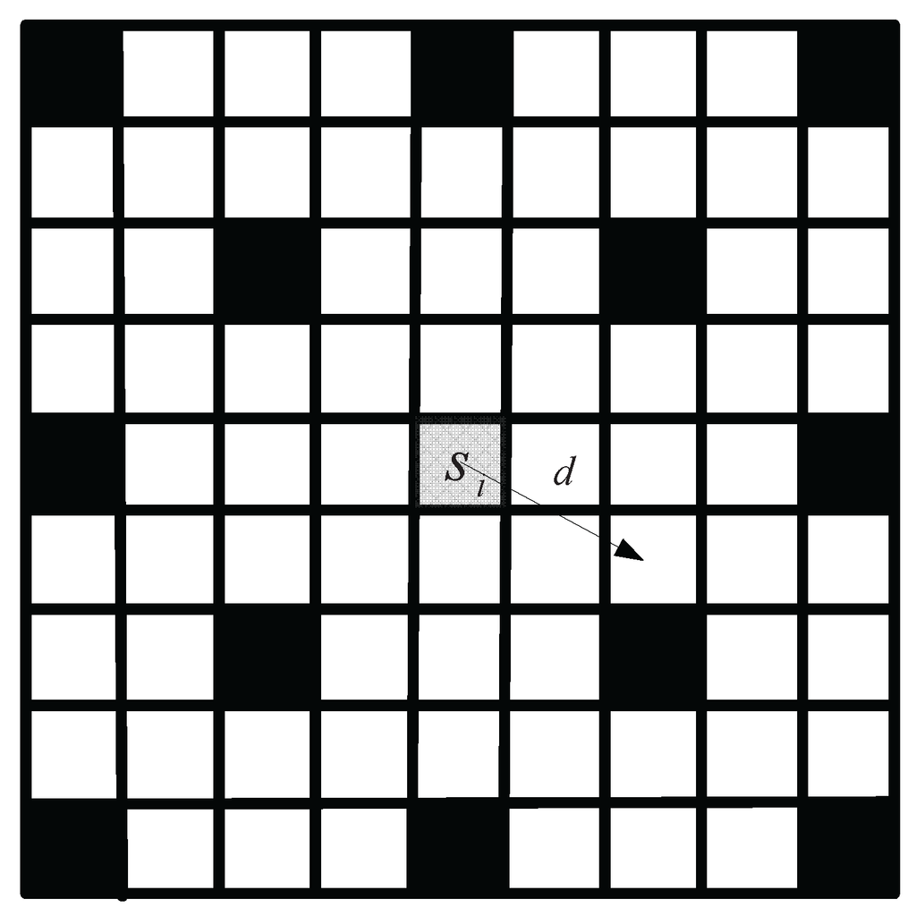 For a specific square , a node in square transmits toward a destination node located in a square at distance d away. At the same time slot, there are four closest squares located at Euclidean distance at least from the receiver, the next eight closest squares are at least Euclidean distance, and so on. By extending the sum of the interference of the network area, we can calculate the upper bound of the interference at the receiver as