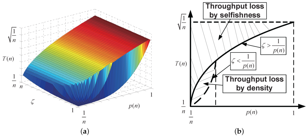 (a) shows the asymptotic throughput capacity of WANETs under the impact of selfish nodes and node density. (b) is a section of (a); We note that there exists a threshold for node density ζ. Comparing with previous literature, we can notice the throughput loss caused by selfish nodes or node density intuitively. The scales of the axes are in terms of the order in n.