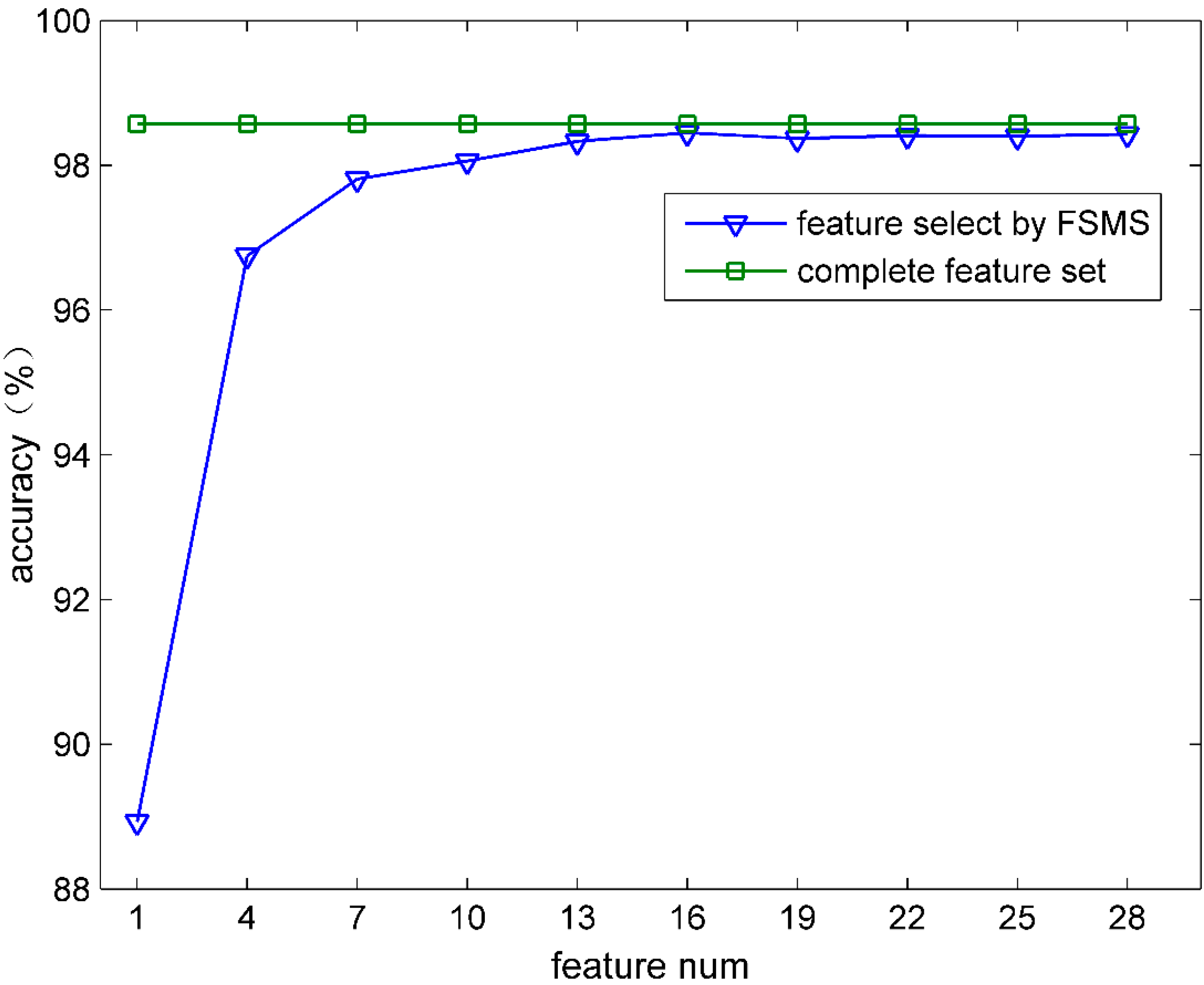 As shown in Figure 2, if the optimal feature subset including 16 features was selected by FSMS, then the optimal accuracy was basically achieved. With the selected features increasing, the accuracy remained mostly unchanged and inclined to the one obtained by the complete feature set. It can be seen that FSMS can also guarantee its classification accuracy when fewer features are selected. The validity of this method is thus proved.