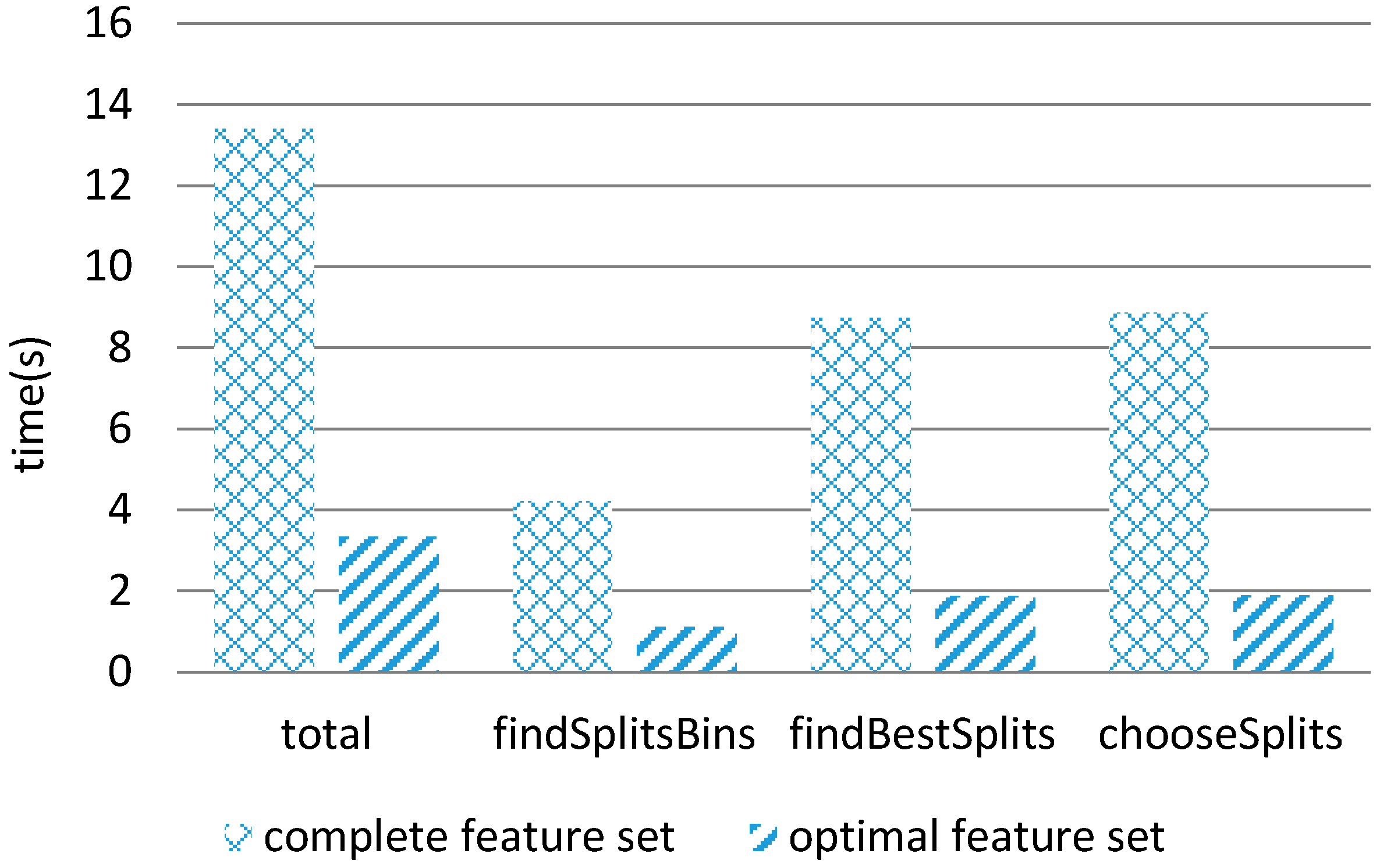 The complete feature set was the raw data that has not yet processed by FSMS, including 249 features in total. The optimal feature subset was a sixteen-dimensional feature set filtered by FSMS. The parameters were expressed this way, total: time for modeling; findSplitsBins: to partition the raw data into buckets according to the feature dimension; findBestSplits: to determine the best split point quickly for each node during the training period in each layer of the decision tree; chooseSplits: time for classification.
