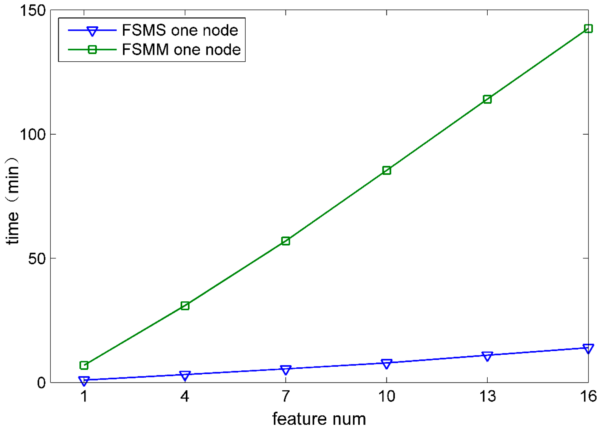 In order to demonstrate the performance of FSMS in the aspect of feature selection velocity, the velocity of FSMS was compared with that of FSMM (feature selection method based on MapReduce). FSMM was implemented by the MapReduce computing framework. Both of them have the same computing procedure and adopt the same classification algorithm. Figure 4 and Figure 5 show the comparison of time that both FSMS and FSMM take to select the features from 1 to 16 when DATA1 and DATA6 are used.