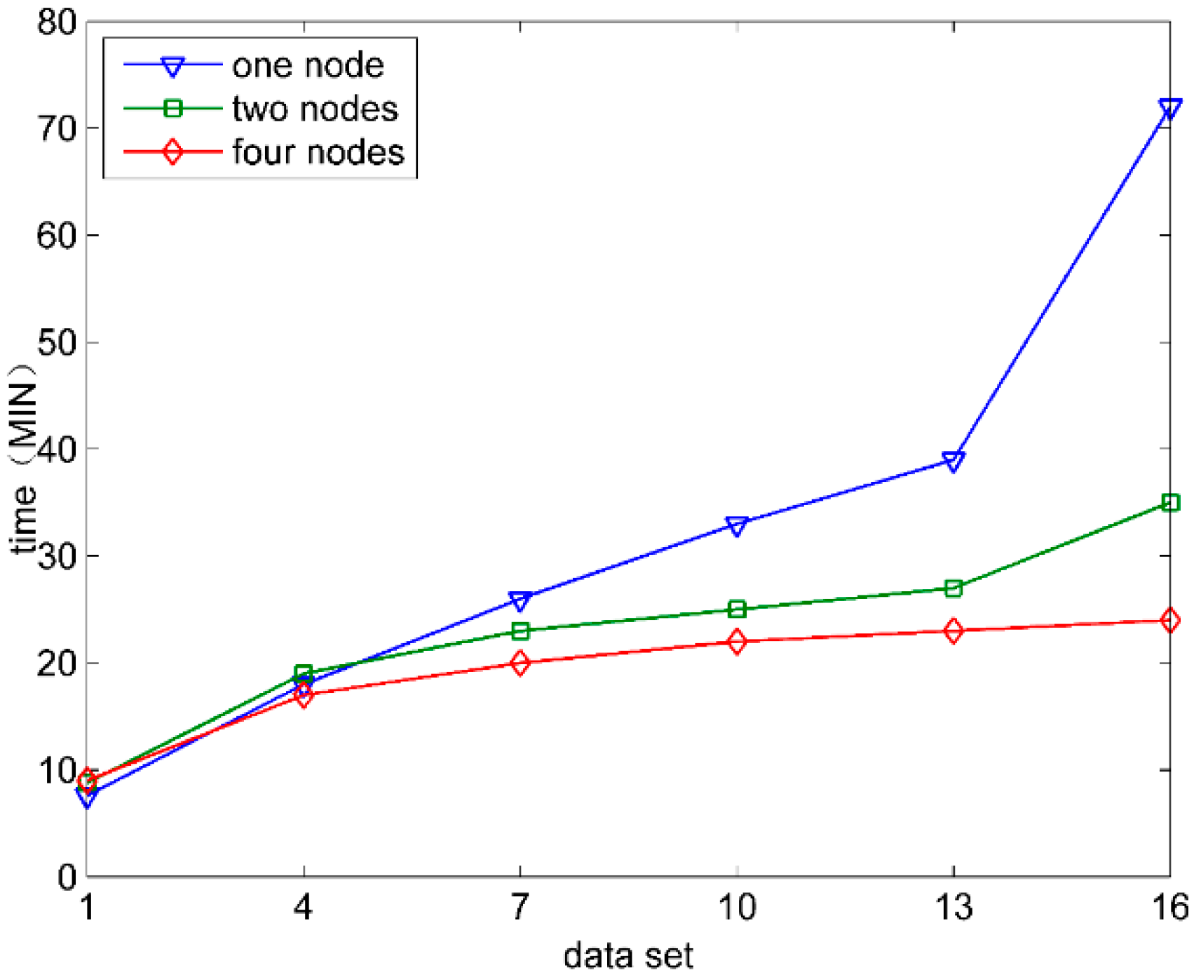 Figure 6 shows the time consumed by the selection of 10 features by FSMS in the case of different computing nodes when Data1 to Data6 are used respectively. When Data1 is used, the consumed time is shown as: single node < dual nodes < four nodes. The reason is that, when the amount of data is small, the computing advantages offered by the increasingly number of nodes are not enough to compensate the time consumed by the multiple node task schedules. However, with the constant increase of data scale, the computing advantages of multiple nodes are shown. The more computing nodes there are, the gentler the increased amplitude of the consumed time is. The running time for single node increases evidently when Data6 is used. This is due to the fact that the single node has limited memory. When the amount of data is too large, the intermediate results of all data and operations cannot be cached in memory by Spark. The data, not being cacheable, will be transferred into local storage. Thus, the time for data storage and data call increases substantially.