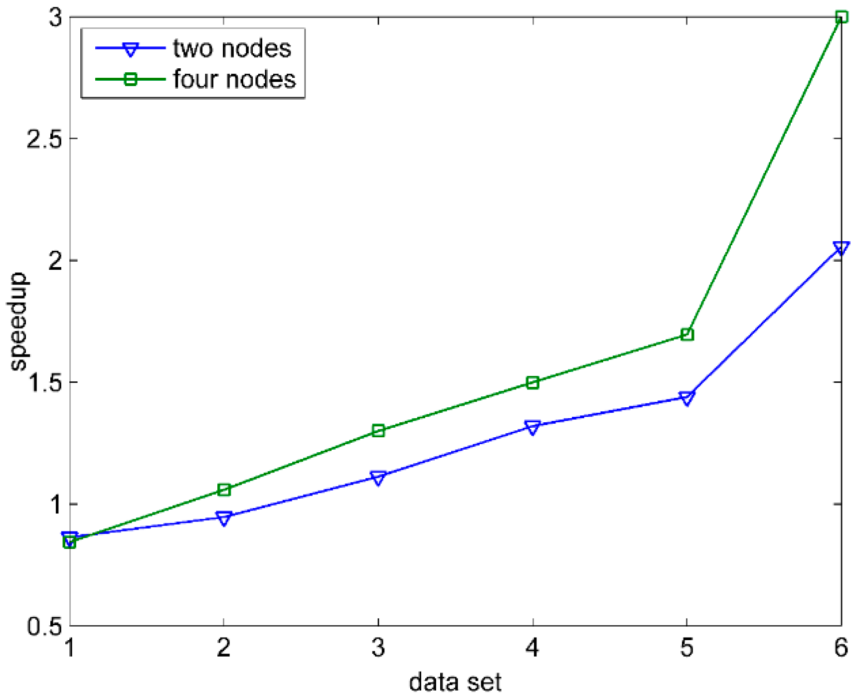 In order to measure the effectiveness of FSMS parallel computation more accurately, the speedup can be an indicator introduced into this paper. The speedup means that the running time is reduced by the parallel computation to improve the performance obtained. The computing formula is: , where is the time consumed by the single node computation, is the time consumed by computing, and the number of nodes is . The higher the speedup is, the less the time consumed by the parallel computation is, and the more highly the parallel efficiency and the performance improve. The given data sets are from Data1 to Data6, and the number of computing nodes includes one node, two nodes and four nodes. Figure 7 describes the performance of the speedup of FSMS based on Spark under different data scales. When the amount of data is small, the speedup of multi-nodes is less than 1, and the cluster computing does not show any advantage. However, as the amount of data increases, the speedup of multi-nodes increases steadily, and the higher the number of nodes is, the faster the amplitude increases. The result shows that, when processing the data with different quantity degree, FSMS can enhance the processing efficiency by increasing or decreasing the size of clusters, which has the capability to be extended.