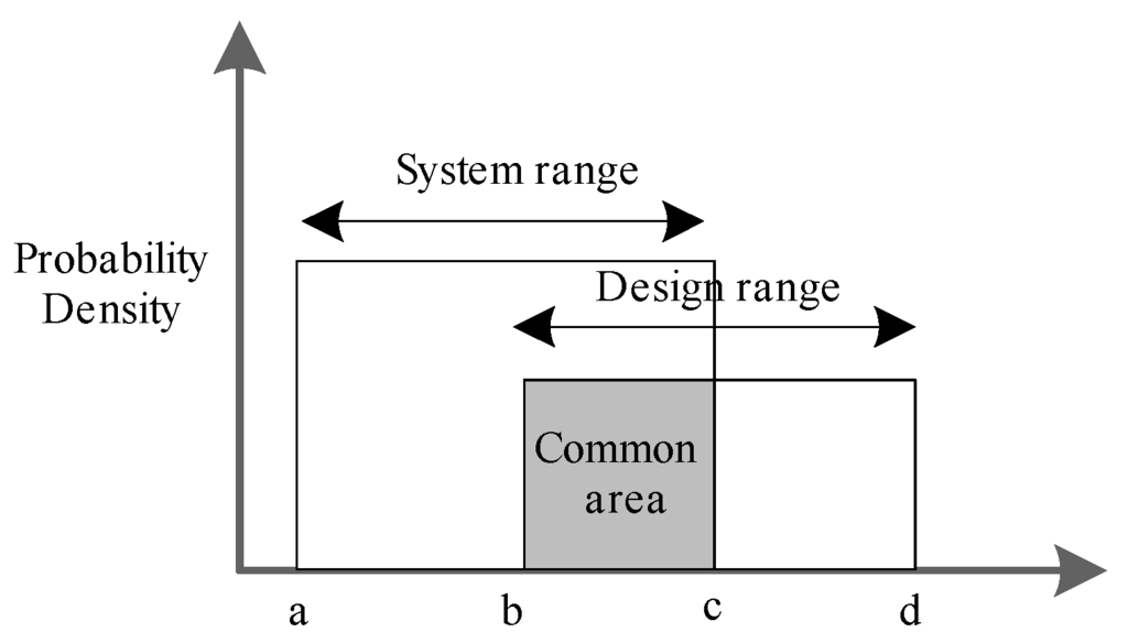 The probability of meeting the function requirement is given by the design range, the system range and the common area. Design range refers to the object of the design and the system range is the capacity that the system achieves. The common area is the intersection area of the design range and the system range, which is just the acceptable solution, as is shown in Figure 2 [28].
