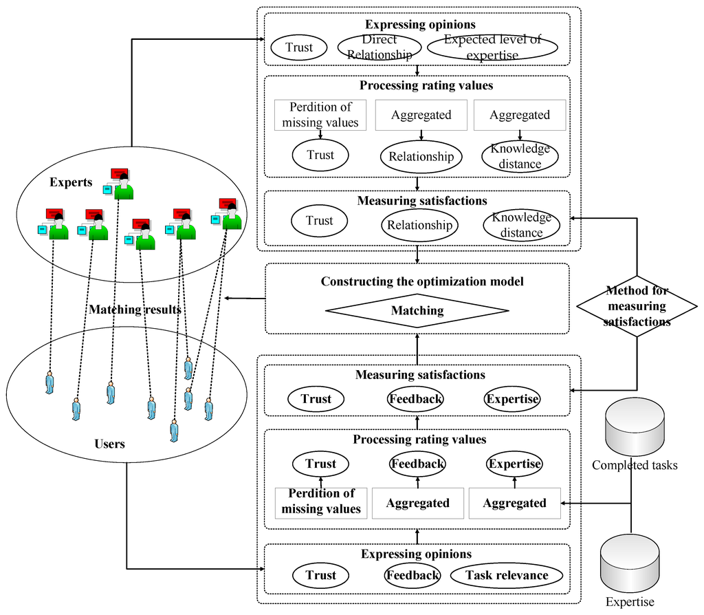 The architecture of the proposed matching approach is shown in Figure 3. Among the five criteria, only the criterion of trust can be used directly. For the criteria feedback, the direct ratings need to be aggregated along with the rating time. For the criteria expertise, knowledge distance and relationship, values need to be derived from the linguistic ratings with respect to the indirect criteria. These indirect criteria include the relevance of completed tasks to knowledge needs (task relevance), the relationship with users or groups (direct relationship) and the expected expertise level of users (expected level of expertise). In the proposed approach, firstly, besides trust and feedback, users and experts are required to rate each other with respect to the indirect criteria. Then the rating values are processed. Afterwards, based on the processed values, the satisfactions are measured. Finally, the optimization model is constructed to derive the optimal match.